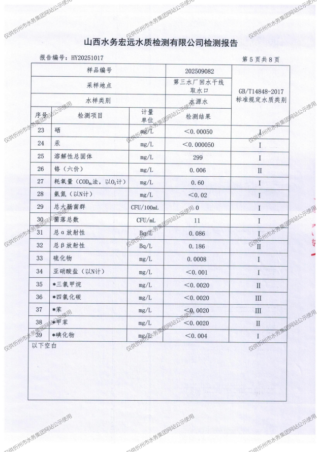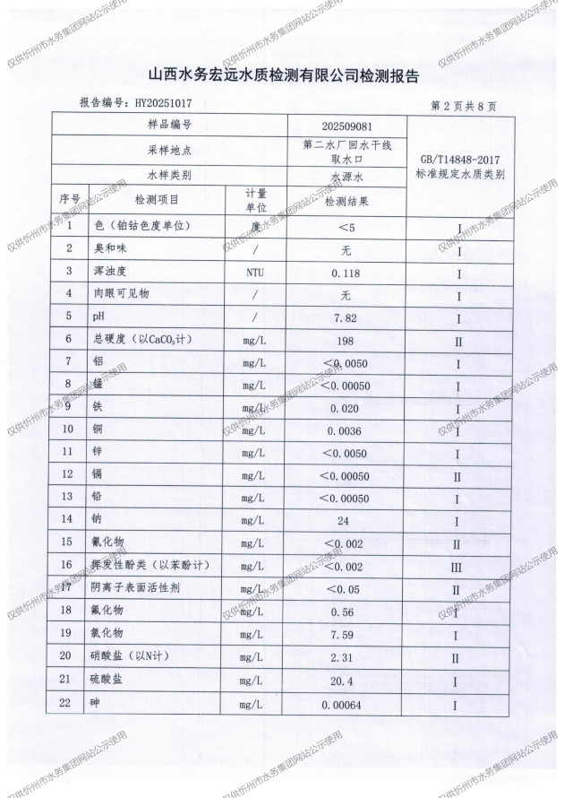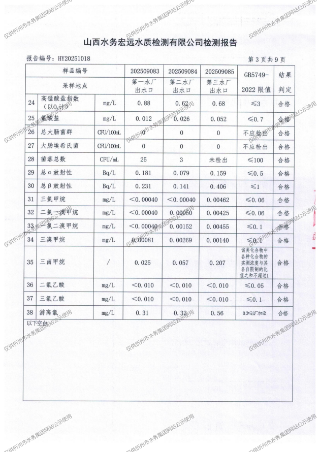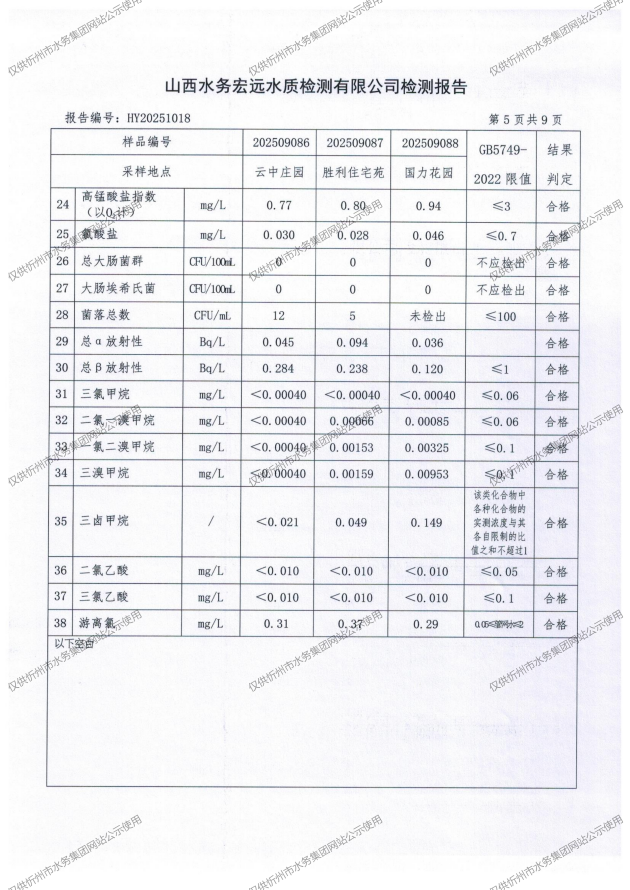 忻州城區(qū)公共供水水源水、出廠水、管網(wǎng)水、管網(wǎng)末梢水2025年9月份水質(zhì)信息公示